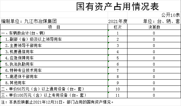 截止2021年12月31日,本单位(单位)国有资产占用情况见公开10表《国有资产占用情况表》。其中车辆中的其他用车共有车辆 0 辆,执法执勤用车 0 辆,特种专业技术用车 0 辆、 其他用车 0 辆;单位价值 50 万元(含)以上通用设备 0 台 (套);单位价值 100 万元(含)以上专用设备 0 台(套)。
