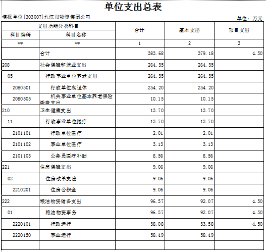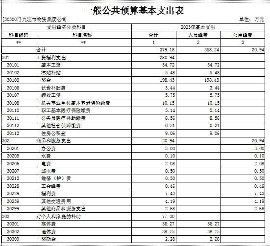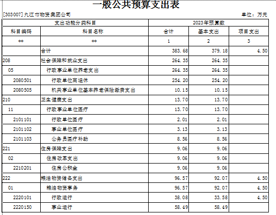 2023年九江市物资集团公司支出预算总额为支出预算总额为383.68万元,较上年预算安排增加200.97元,增加原因政府性奖金列入年初预算。其中: