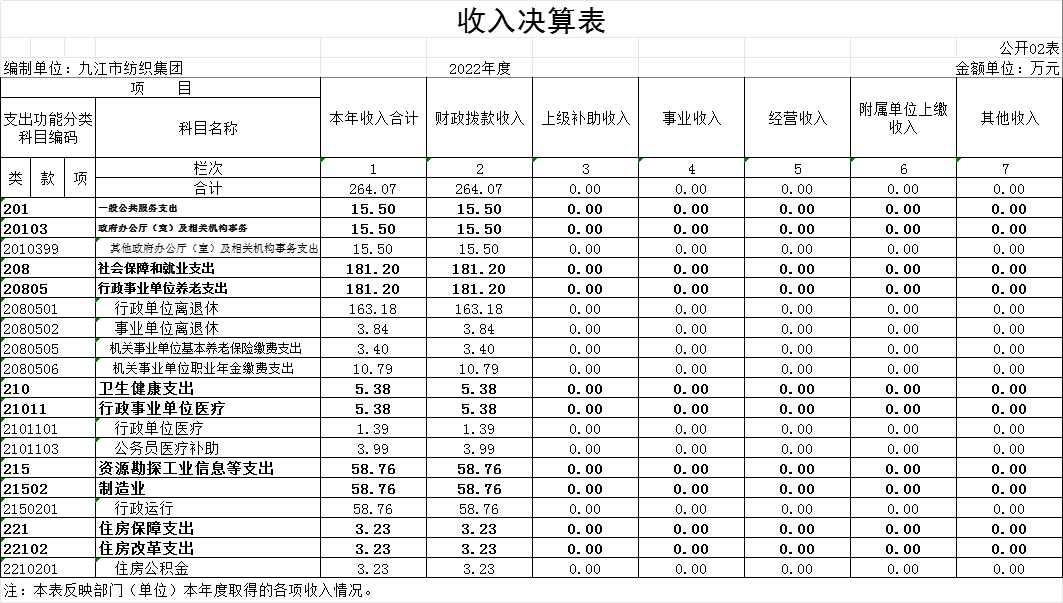 本单位2022年度收入总计264.07万元,其中年初结转和结余 0万元,和2021年持平;本年收入合计264.07万元,较2021年减少8.61万元,下降3.2%;主要原因是:在职人员和退休人员有所减少。