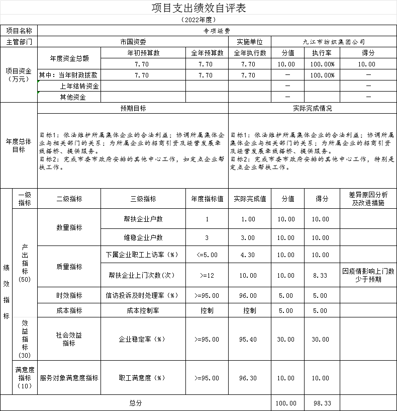 根据预算绩效管理要求,我单位组织对纳入2022年度部门预算范围的二级项目1个全面开展绩效自评,共涉及资金7.70万元,占项目支出总额的100%。
