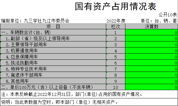 截止2022年12月31日,本部门国有资产占用情况见公开10表《国有资产占用情况表》。本部门车辆为0辆,无单位价值50万元以上通用设备;无单位价值100万元以上专用设备。