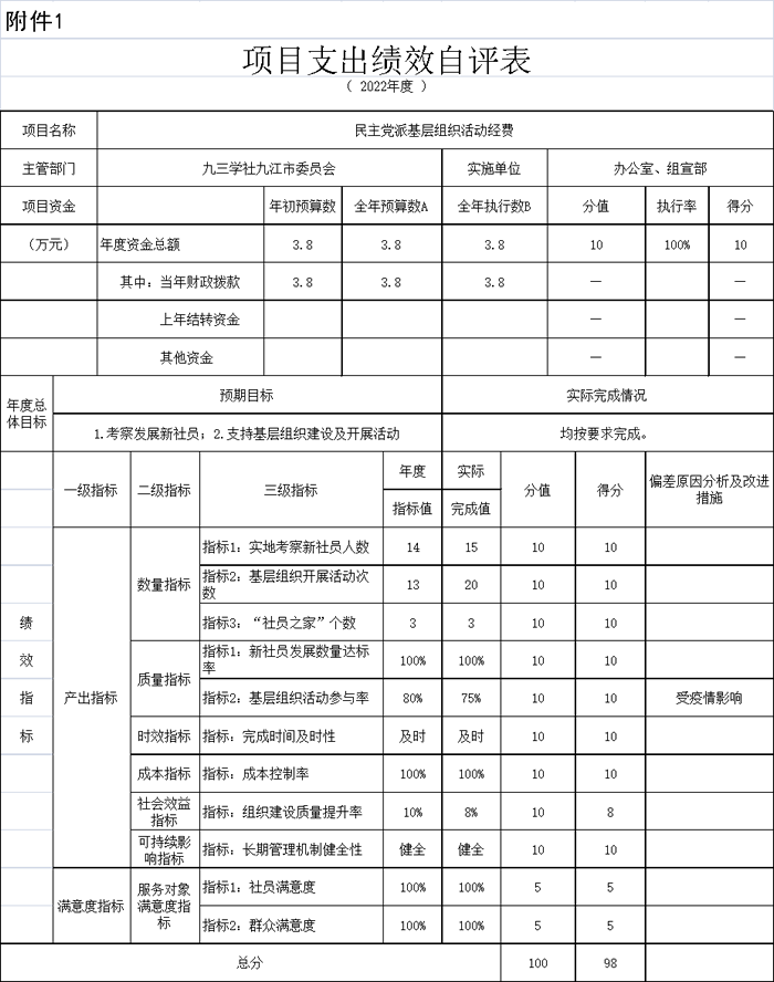 1.民主党派基层组织活动经费3.8万元:项目立项依据:九府办抄字〔2022〕14号文:【江西省财政厅关于切实解决民主党派基层组织活动经费的通知】市县(区)财政部门参照省级每人每年200元的标准(按实际人数),从2022年起列入部门预算。主要是建立社员活动阵地建设和社组织规范化建设,加强和改进新形势下民主党派自身建设,认真落实社组织工作经费保障,均已按质按量完成。
