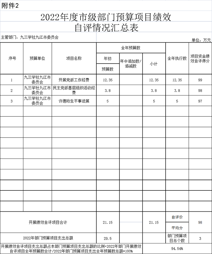 (二)项目绩效目标:2022年预算安排九三学社九江市委会项目专项资金共21.15万元,主要包括:民主党派基层组织活动经费3.8万元、开展党派工作12.35万元、许德珩生平事迹展5万元。