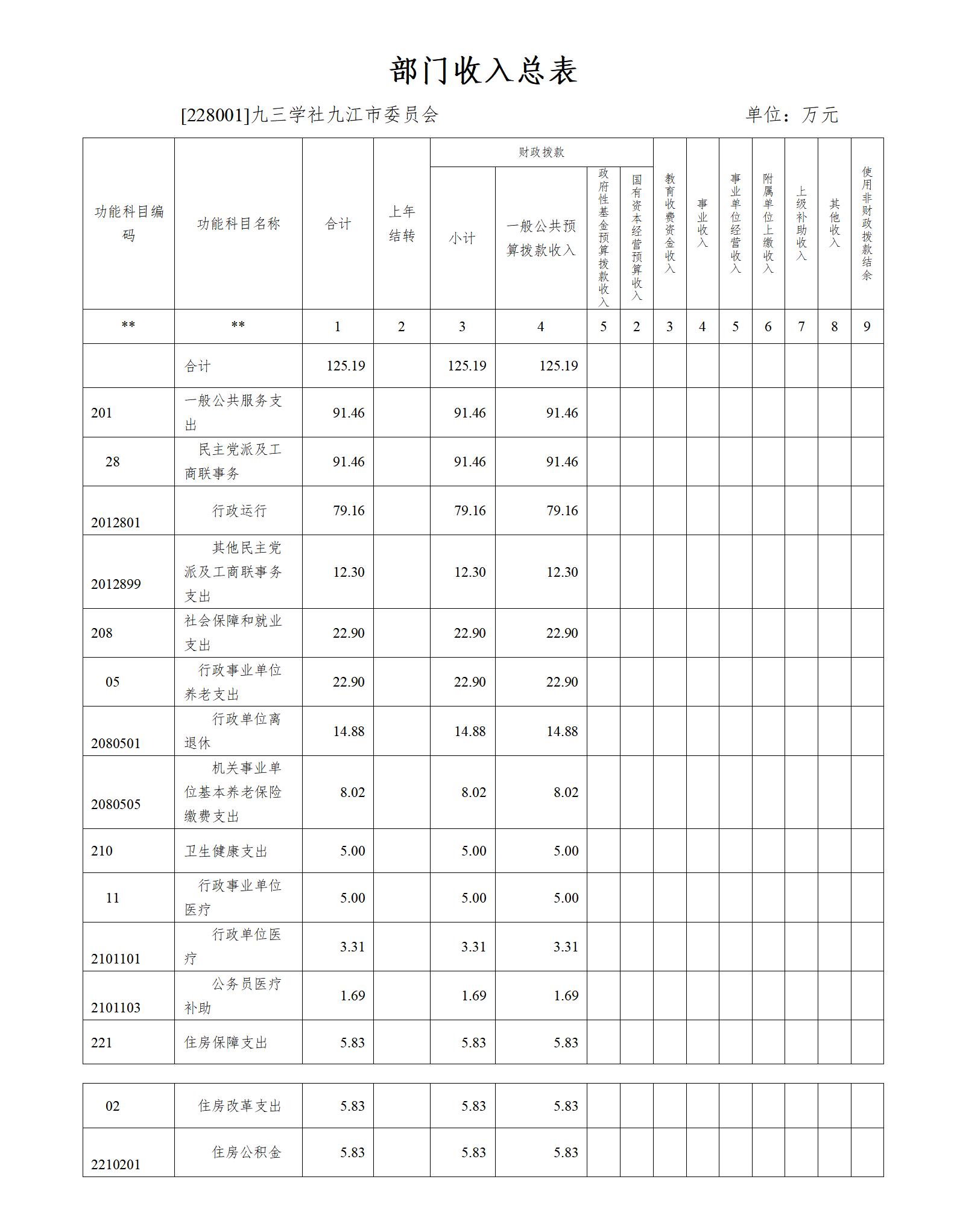 2023年九三学社九江市委会收入预算总额为125.19万元,较上年预算安排增加37.29万元;财政拨款收入125.19万元,较上年预算安排增加37.29万元;教育收费资金收入0万元,较上年预算安排增加0万元;事业单位经营收入0万元,较上年预算安排增加0万元;国库集中支付网上结转0万元,较上年预算安排增加0万元。