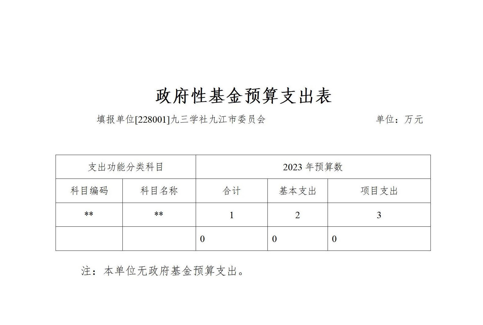2023年九三学社九江市委员会政府性基金预算支出为0万元。