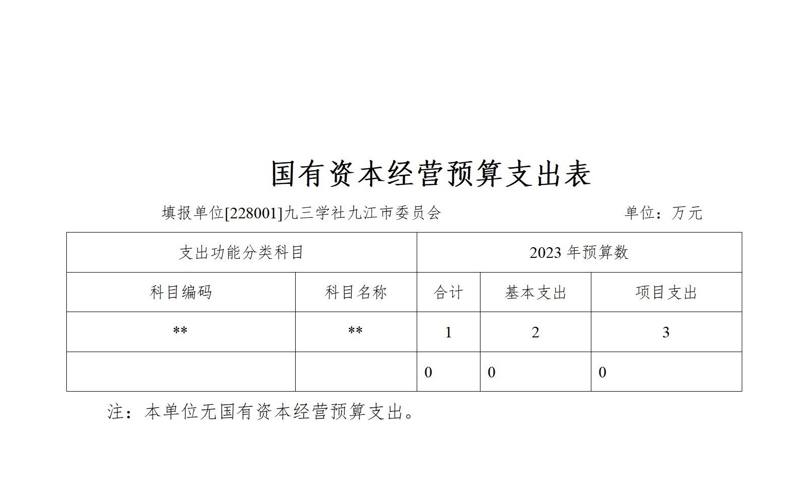 2023年九三学社九江市委会国有资本经营支出预算为0万元。