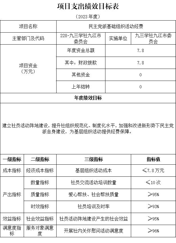 1)项目概述:民主党派基层组织活动经费7.8万元。主要是用于建立社员活动阵地建设,提升社组织规范化、制度化水平,加强和改进新形势下民主党派自身建设,为基层组织活动提供经费保障。