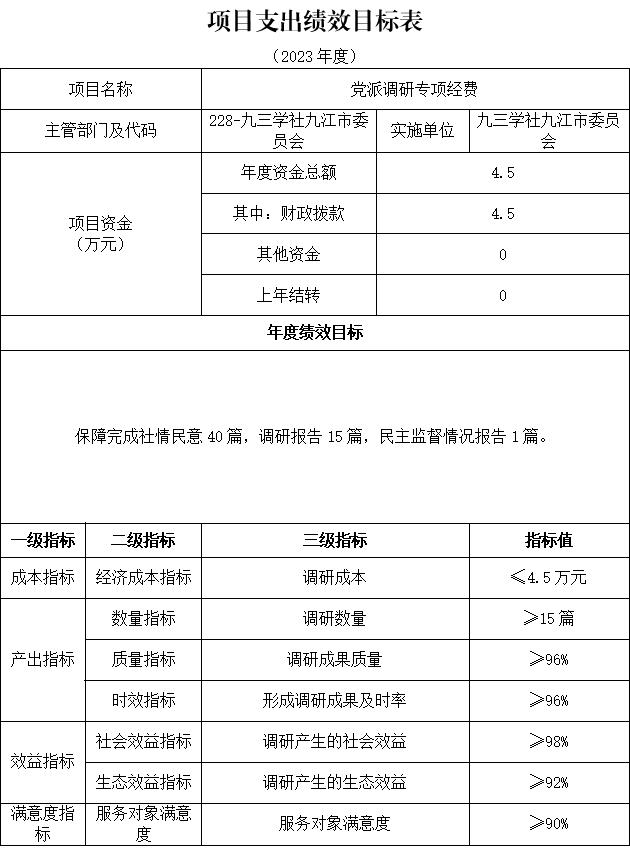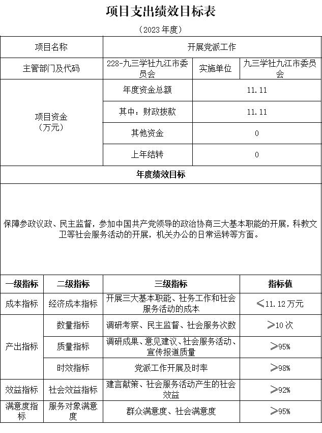 十一、《项目绩效目标表》,详见第三部分第一条第九点:九三学社九江市委员会项目情况说明。