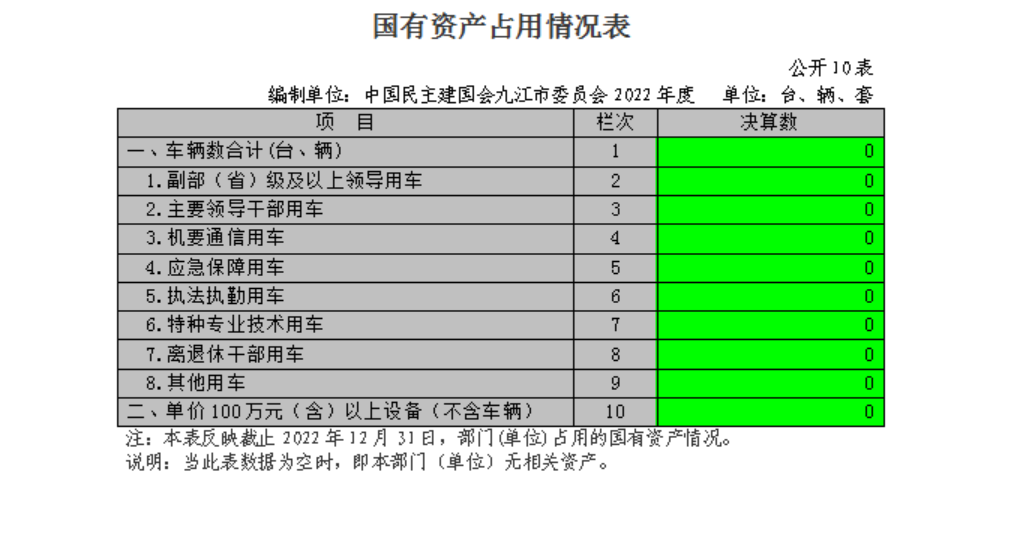 截止2022年12月31日,本部门(单位)国有资产占用情况见公开10表《国有资产占用情况表》。本部门车辆为0辆,无单位价值50万元以上通用设备,无单位价值100万元以上专用设备。