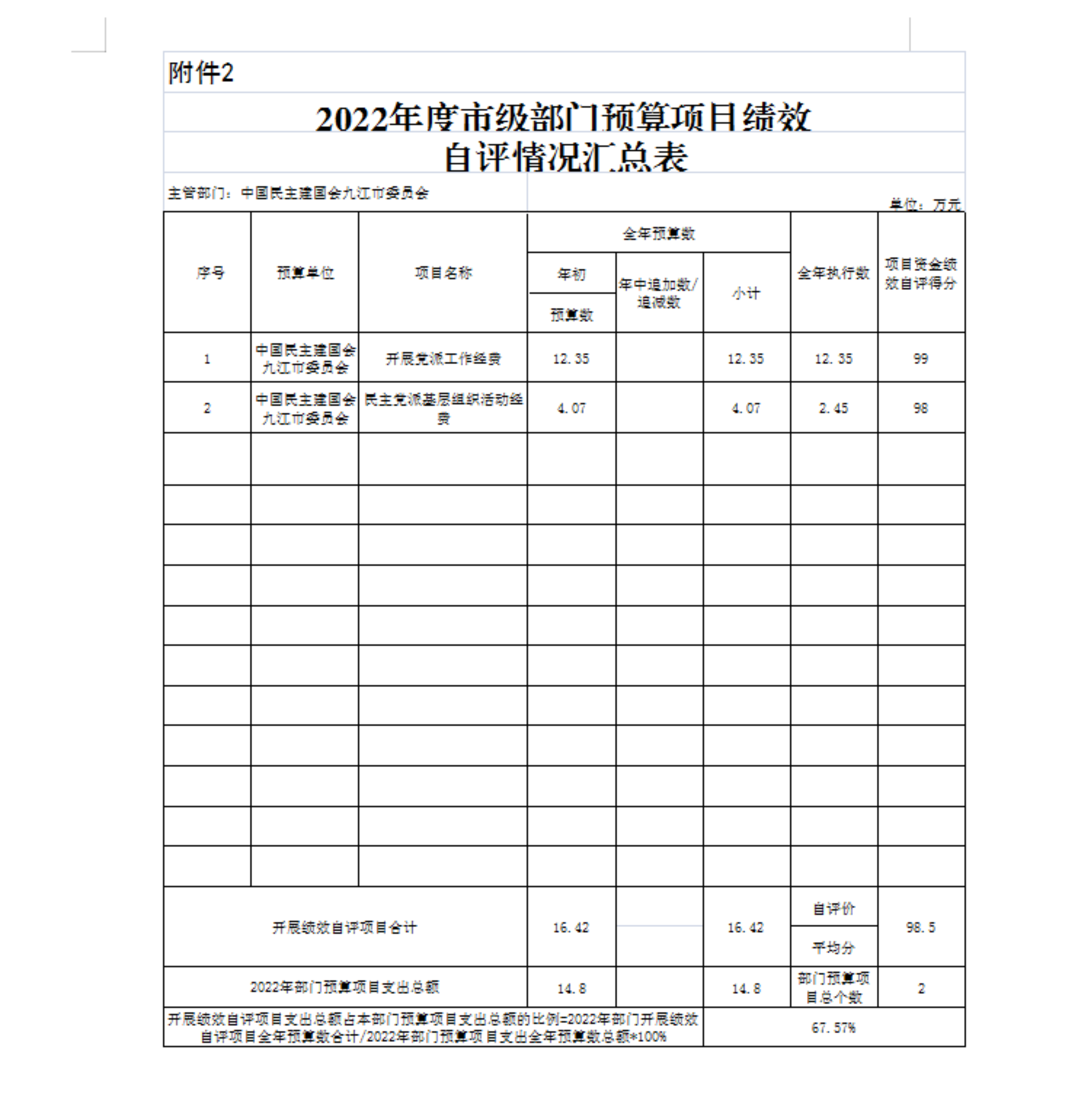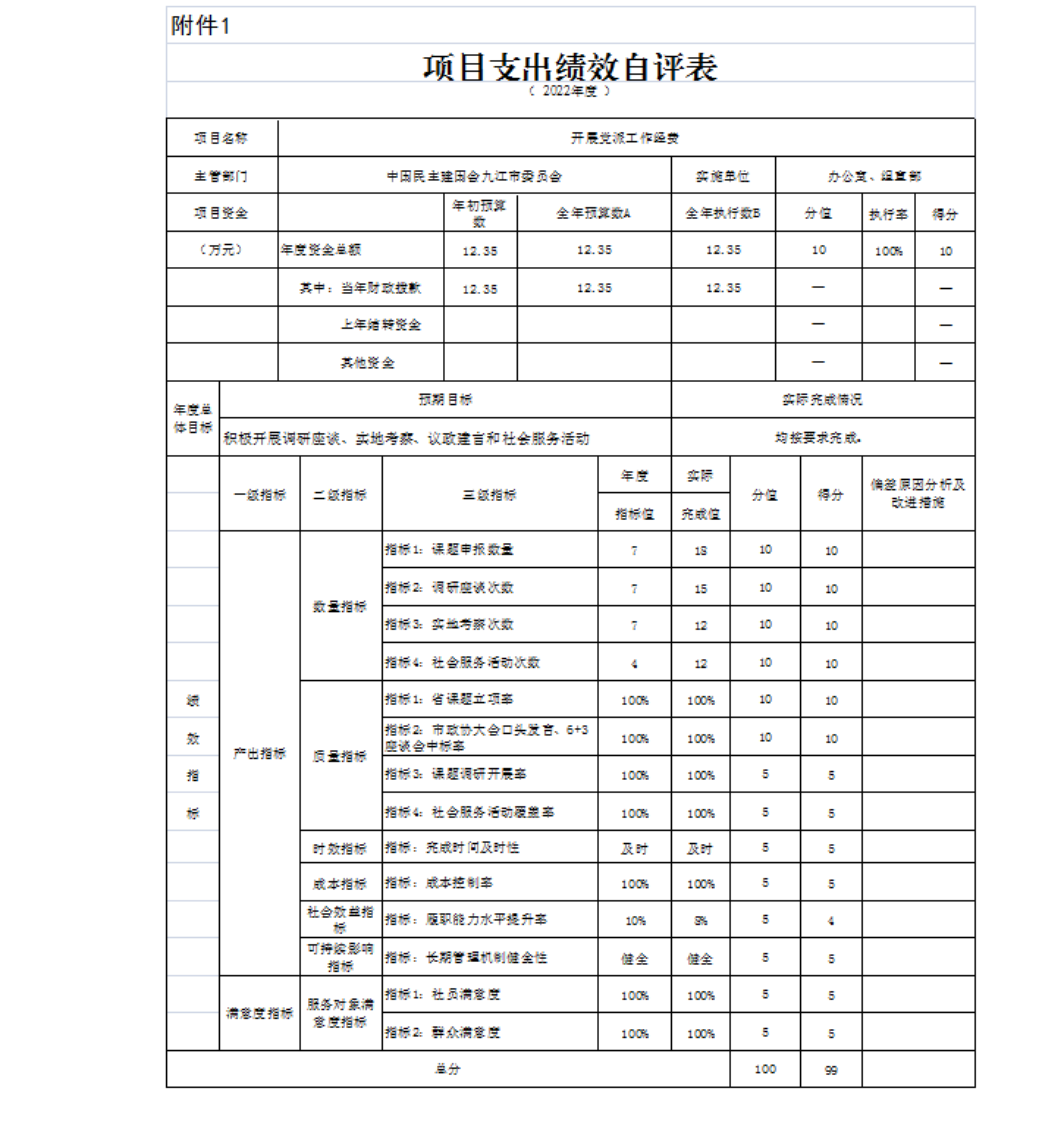 组织对民建九江市委会等1 个部门开展整体支出绩效评价试点,涉及一般公共预算支出138.24万元,政府性基金预算支出 0 万元。项目绩效自评总体综述:根据年初设定的绩效目标1、民主党派基层组织活动经费2、开展党派工作自评得分为99分。项目全年预算16.42万元,执行数为14.8万元,完成预算的90.1%。以上项目按照年初目标任务和资金预算情况稳步推进,为全市经济发展、社会稳定和谐取得了积极的成效。