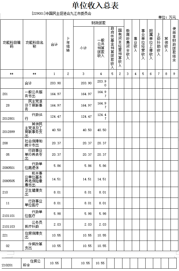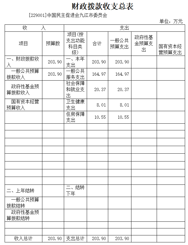 2023年民进九江市委会收入预算总额为203.9万元,较上年预算安排增加63.08万元;财政拨款收入203.9万元,较上年预算安排增加63.08万元;教育收费资金收入0万元,较上年预算安排增加0万元;事业单位经营收入0万元,较上年预算安排增加0万元;国库集中支付网上结转0万元,较上年预算安排增加0万元。
