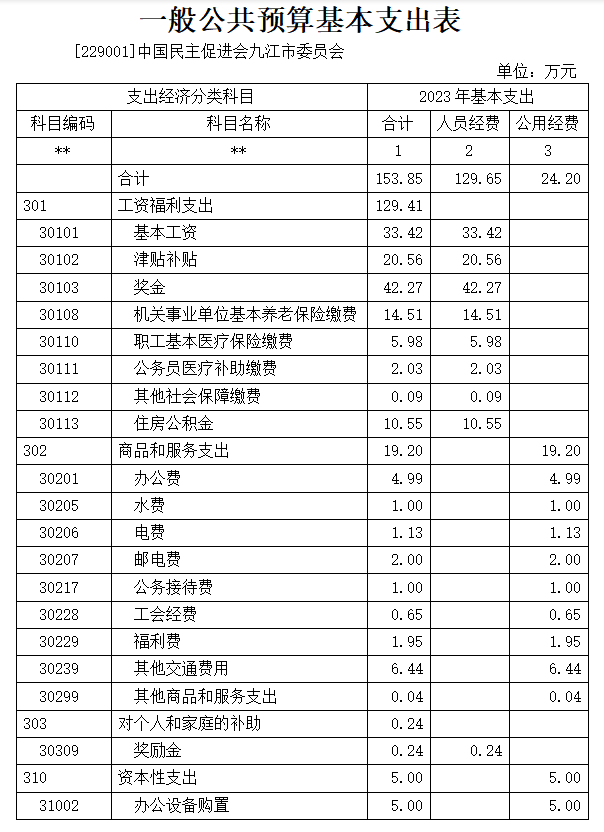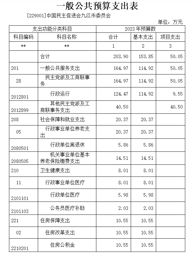 2023年民进九江市委会支出预算总额为支出预算总额为203.9万元,较上年预算安排增加63.08万元;其中:
