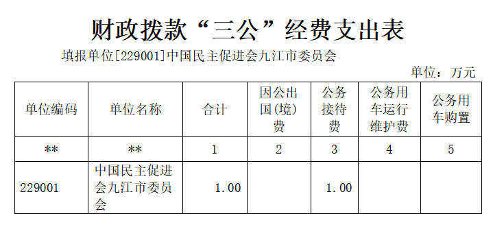 2023年民进九江市委会"三公"经费财政拨款安排 1.0万元,其中: