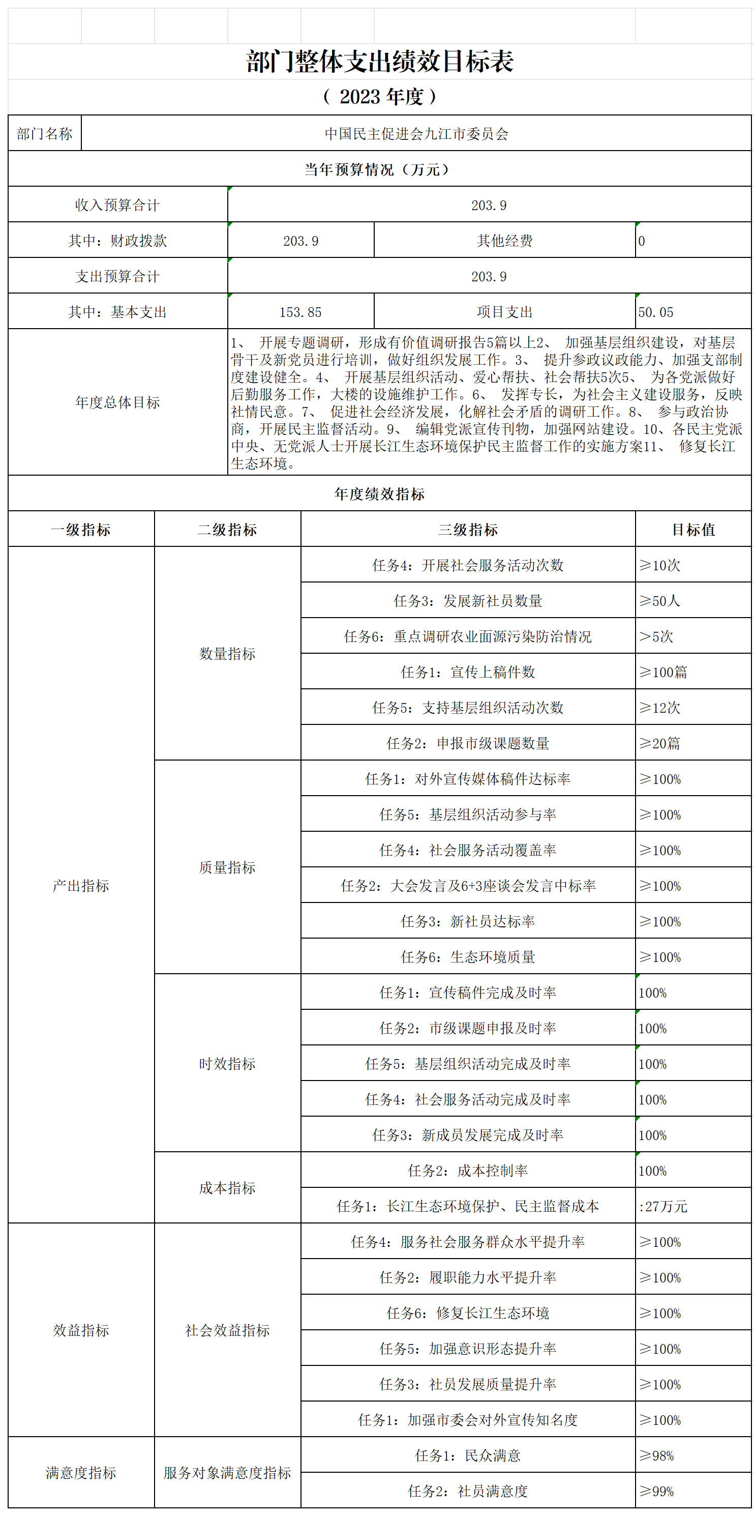 2023年民进九江市委会财政拨款支出预算总额为财政拨款支出预算总额203.9万元,较上年预算安排增加63.08万元;