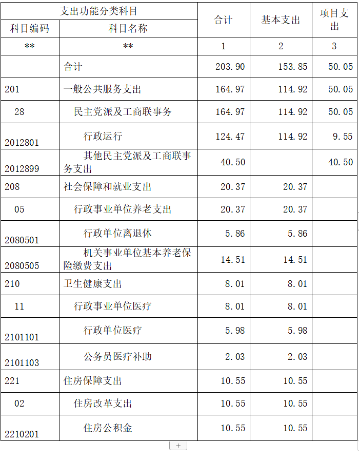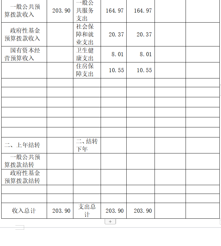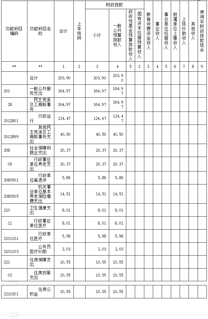 按支出功能科目划分:一般公共服务支出164.97万元,教育支出0万元,社会保障和就业支出20.37万元,卫生健康支出8.01万元,住房保障支出10.55万元。