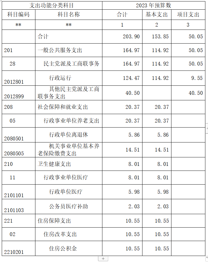 2023年民进九江市委会支出预算总额为支出预算总额为203.9万元,较上年预算安排增加63.08万元;其中: