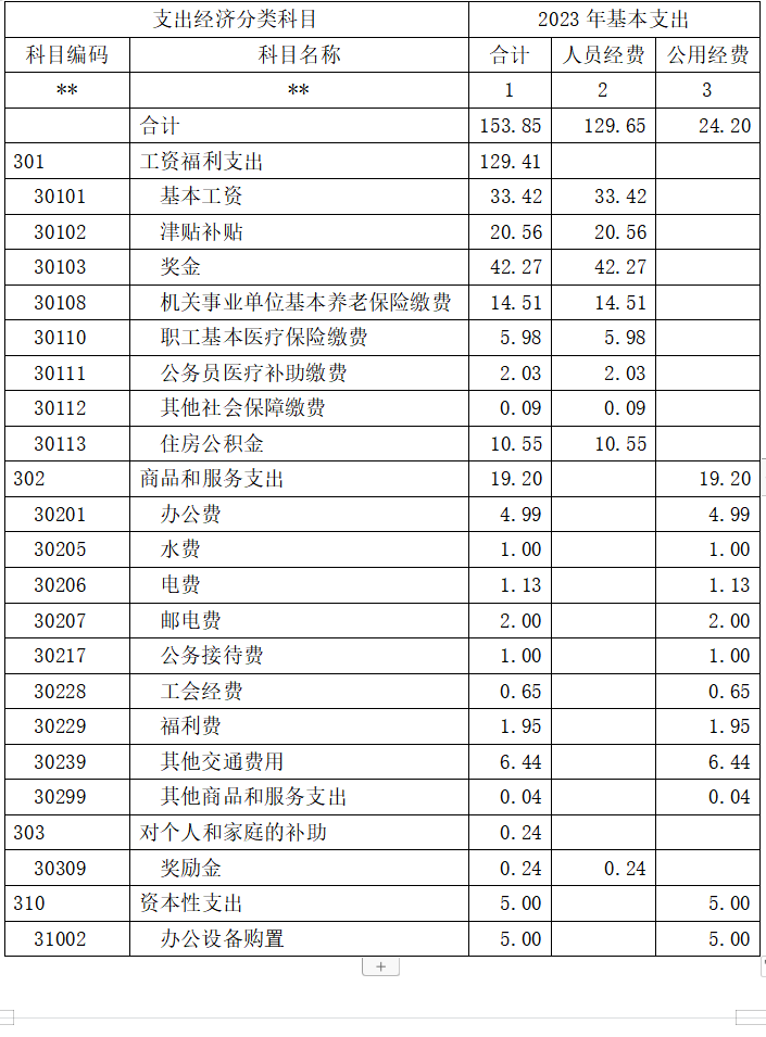 按支出经济分类划分:工资福利支出129.41万元,较上年预算安排增加58.13万元;商品和服务支出19.2万元,较上年预算安排减少5.17万元;对个人和家庭的补助0.24万元,较上年预算安排增加减少0万元;资本性支出5万元,较上年预算安排增加5万元;对企业补助0万元,较上年预算安排增加(减少)0万元。