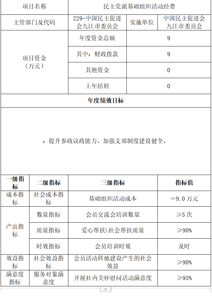 1)项目概述:民主党派基层组织活动经费9.0万元。主要是组织调研考察、议政座谈、宣传报道开展社会服务等,保障民主党派基层能够开展和组织日常活动。