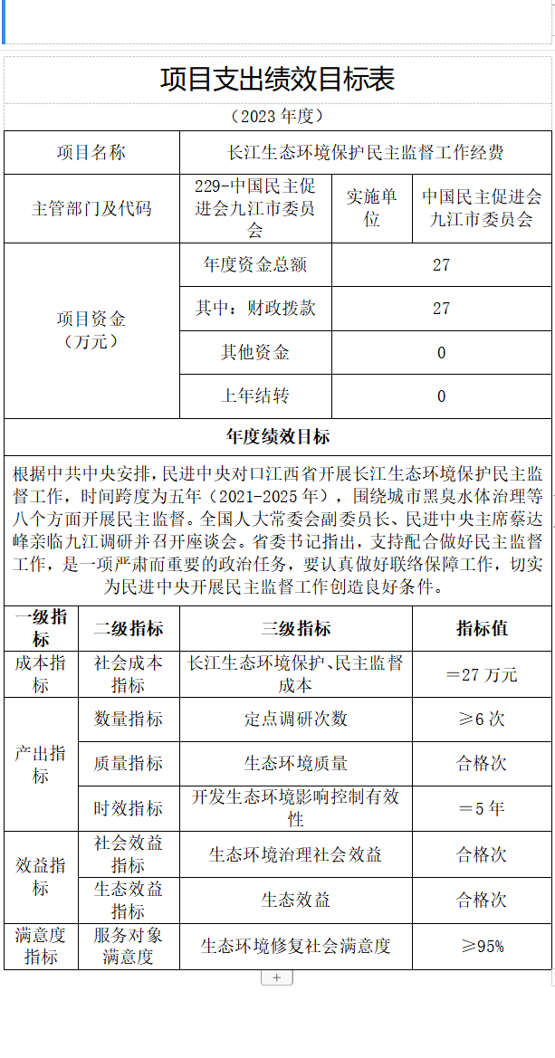 1. 项目概述:长江生态环境保护民主监督工作经费27万元。根据中共中央安排,民进中央对口江西省开展长江生态环境保护民主监督工作,时间跨度为五年(2021-2025年),围绕城市黑臭水体治理等八个方面开展民主监督。全国人大常委会副委员长、民进中央主席蔡达峰亲临九江调研并召开座谈会。省委书记指出,支持配合做好民主监督工作,是一项严肃而重要的政治任务,要认真做好联络保障工作,切实为民进中央开展民主监督工作创造良好条件。