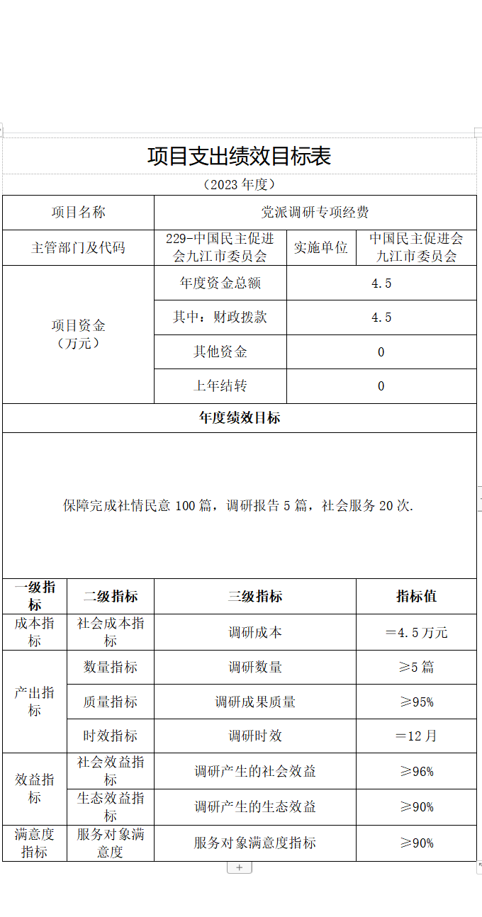 1.项目概述:民主党派调研经费4.5万元。主要是为全面落实习近平总书记“四新”“三好”要求,支持民主党派加强自身建设、更好履行职能,保障党派成员专家能深入调查研究,发挥建言献策、民主监督的作用。