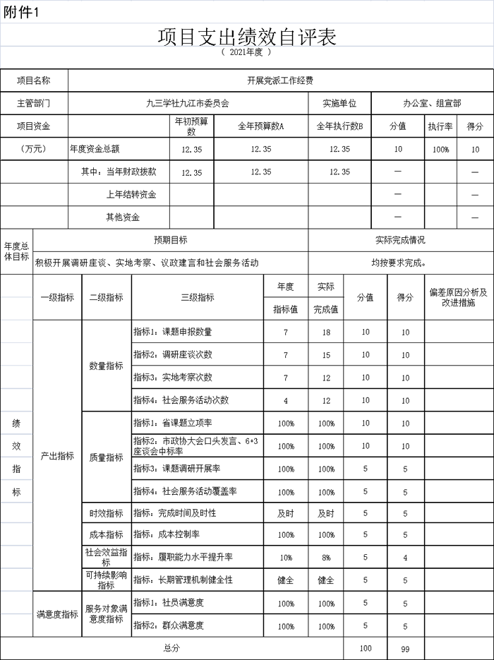 项目绩效自评总体综述:根据年初设定的绩效目标1、民主党派基层组织活动经费2、开展党派工作3、许德珩生平事迹展,绩效自评得分为98分。项目全年预算21.15万元,执行数为21.15万元,完成预算的100%。项目绩效目标完成情况:以上项目按照年初目标任务和资金预算情况稳步推进,一是保障了我市各基层社组织的活动能够顺利开展;二是保障了市委会机关工作平稳运行;三是保障了许德珩生平事迹展日常展览有序推进。发现的问题及原因:相关机制有待完善,虽然按照财政部门要求出台了制度、设定了流程,但是目前还处于探索阶段,很多指标体系和指标设置科学性还有提高空间。下一步改进措施:以问题为导向,进一步加强对财政资金的绩效管理,探索在疫情防控常态化的情况下,如何高质高效使用财政资金,通过部门整体支出绩效评价以及其他管理工作,实现资金使用全程监督和问题的实时跟踪,确保财政资金的使用效益。