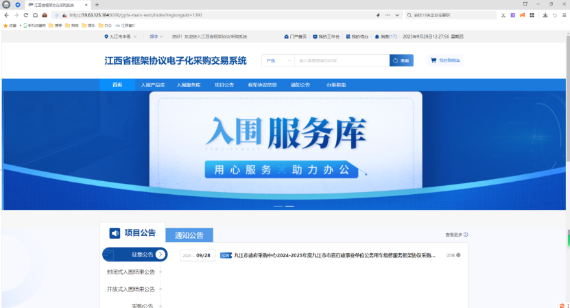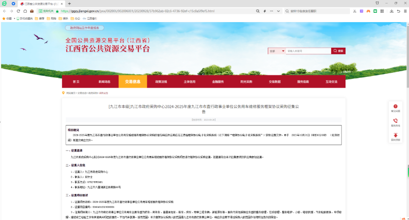 9月28日,九江市在江西省框架协议电子化采购交易系统、江西省公共资源交易平台、江西省政府采购网同步发布了“2024-2025年度九江市市直行政事业单位公务用车维修服务框架协议采购项目”的征集公告,这是全省首个全流程电子化框架协议采购项目,也是全省首个“公务用车维修服务”品目的框架协议采购项目,开创了江西省全流程电子化框架协议采购的先河。
