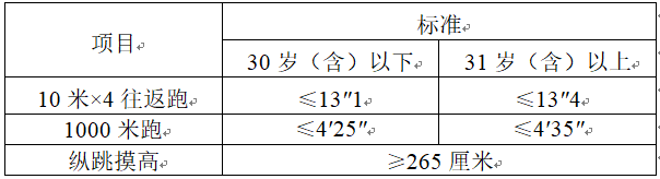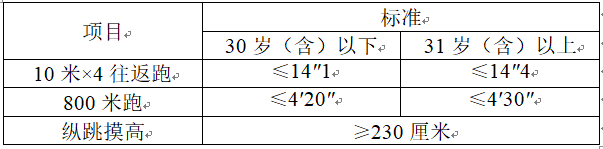 1、人民警察测评项目和标准按人力资源和社会保障部、公安部、国家公务员局《关于印发公安机关录用人民警察体能测评项目和标准(暂行)的通知》(人社部发〔2011〕48号)执行。其中,男子1000米跑、女子800米跑项目的测评次数为1次,10米×4往返跑项目测评次数为不超过2次,纵跳摸高的测评次数为不超过3次。