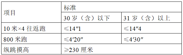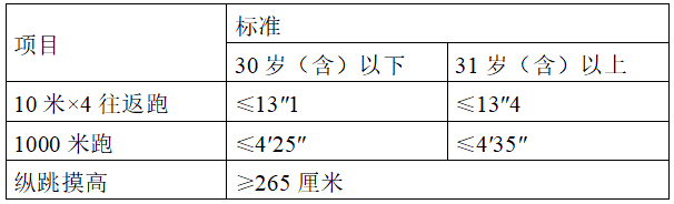 1.人民警察测评项目和标准按人力资源和社会保障部、公安部、国家公务员局《关于印发公安机关录用人民警察体能测评项目和标准(暂行)的通知》(人社部发〔2011〕48号)执行。其中,男子1000米跑、女子800米跑项目的测评次数为1次,10米×4往返跑项目测评次数为不超过2次,纵跳摸高的测评次数为不超过3次。