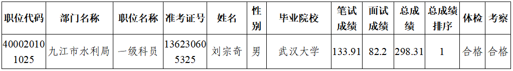 根据省委组织部统一部署的2022年度考试录用公务员工作有关规定,刘宗奇同志经过报名、笔试、资格审查、面试、体检和考察等工作程序,由于疫情原因按规定延期体检,暂缓录用。现刘宗奇同志体检合格,拟录用为九江市水利局公务员,予以公示。
