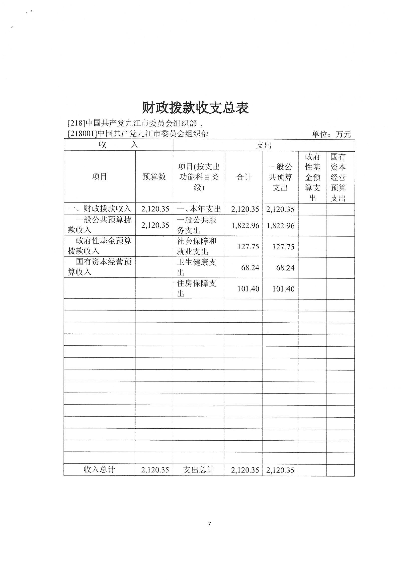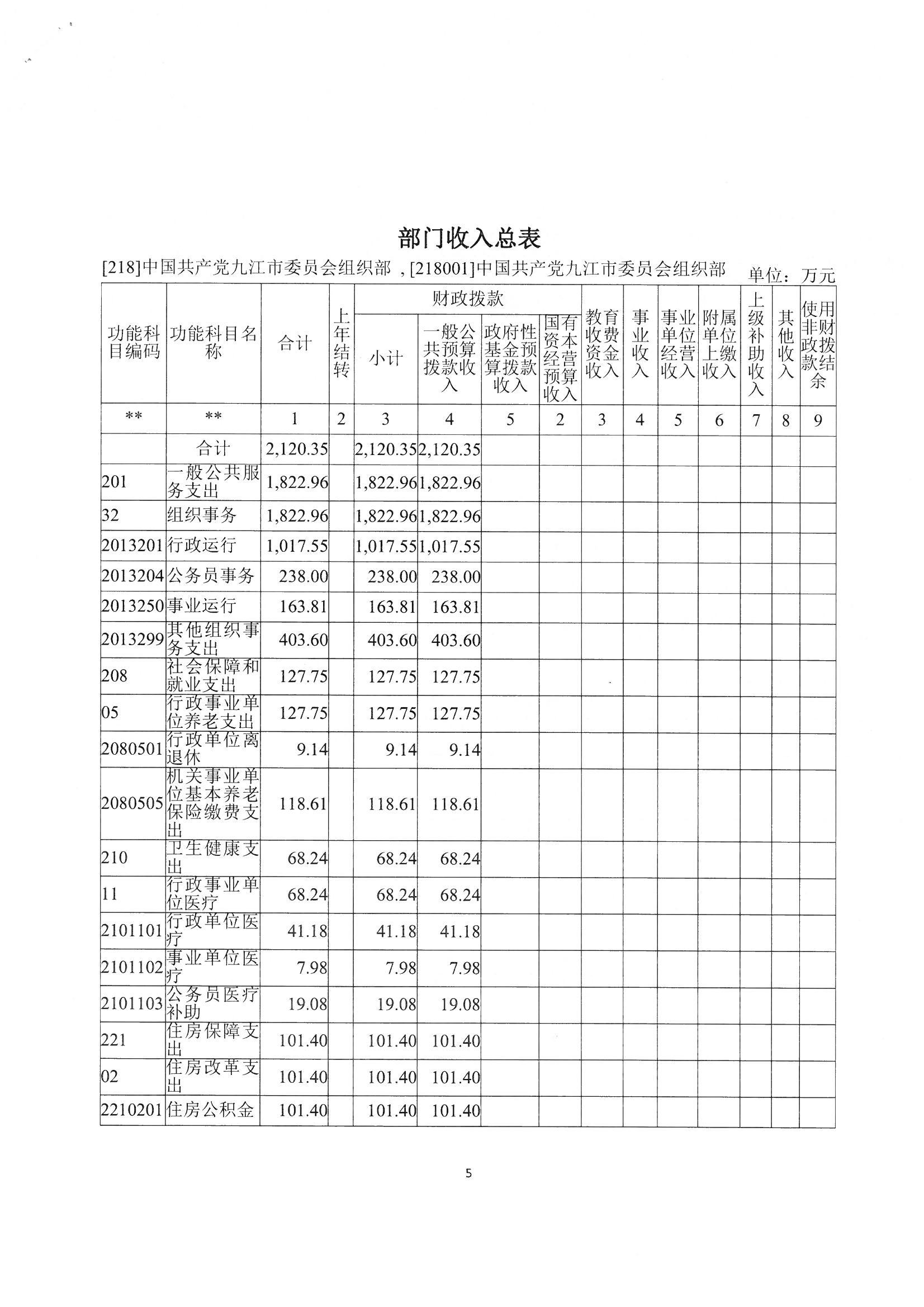 2024年九江市委组织部收入预算总额为2120.35万元,较上年预算安排增加390.11万元;财政拨款收入2120.35万元,较上年预算安排增加390.11万元,主要原因:一是增加绩效奖金及伙食费预算;二是增加项目支出预算。