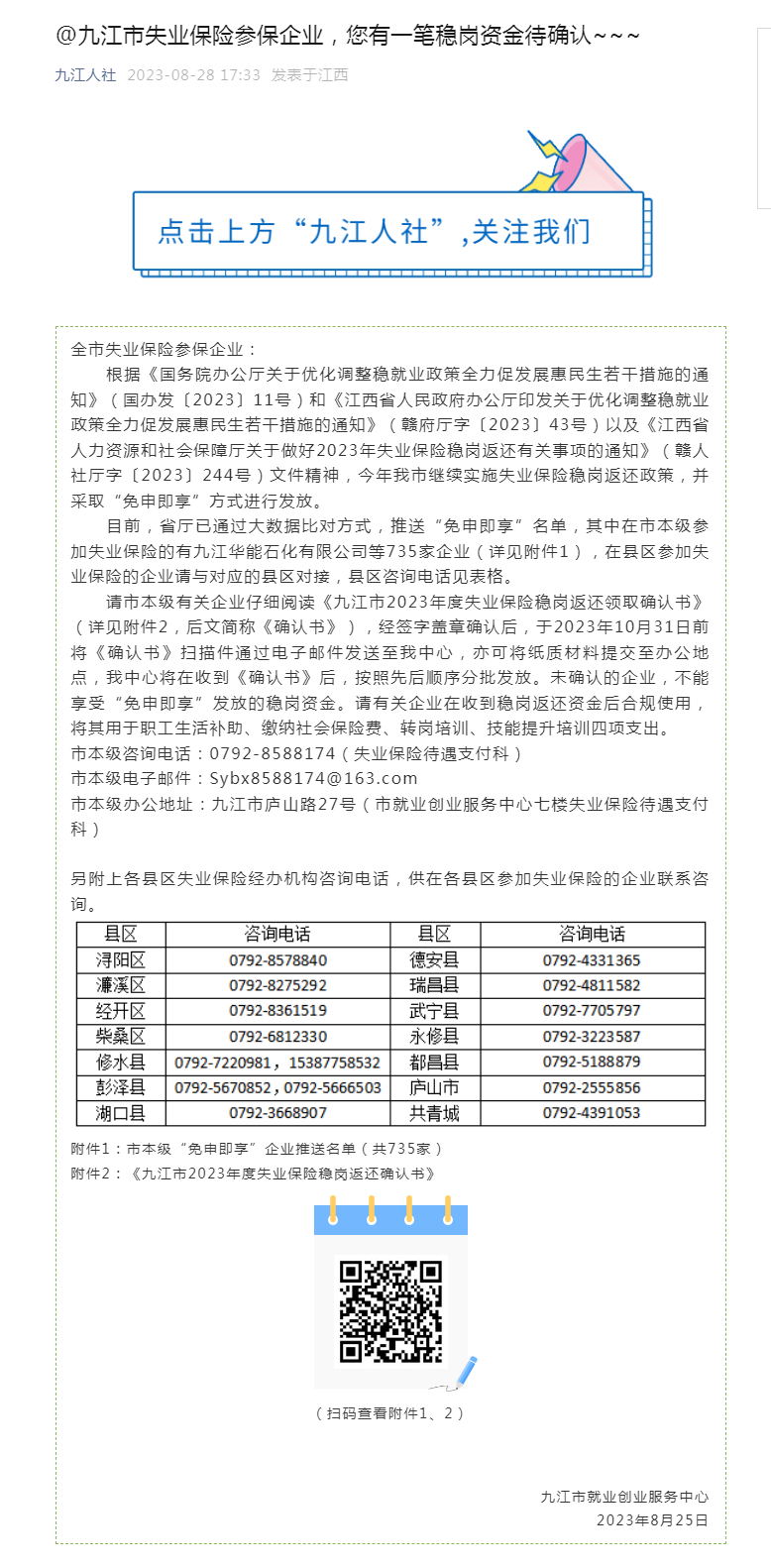 媒体解读:@九江市失业保险参保企业,您有一笔稳岗资金待确认~~~