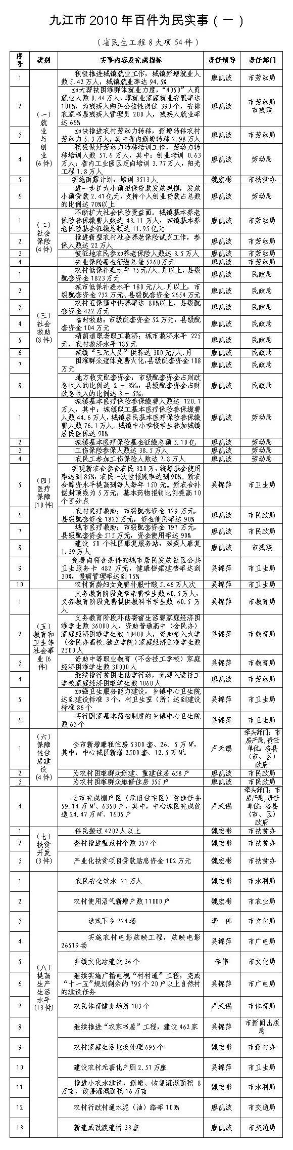 (六)始终坚持一手抓发展、一手托民生的原则,发展为民加快赶超。主要抓了三个方面的工作:一是提升就业创业水平。新增城镇就业7.9万人,新增转移农村劳动力10.9万人,新增小额担保贷款4.4亿元,新增个体户2.6万户、私营企业2800户。免费培训9.2万农村劳动力,免费进行技能和创业培训6.6万人,扶助就业创业工作居全省首位。二是提升社会救助水平。城乡低保对象补助标准月人均补差分别达到180.3元、78.8元。农村五保户供养标准年人均提高60元。上世纪六十年代精简下放老职工救济金城乡月人均补助分别达到200元、160元,城镇“三无”特困群众供养标准月人均提高到300元。救助家庭困难学生4.2万人。对因突发性事件造成生活困难的群众实行临时救助。建立因自然灾害死亡人员抚慰金制度。为2.6万名残疾人免费提供康复服务。推进“光明·微笑”工程,完成白内障复明手术1.2万例、唇腭裂修复手术623例。三是提升各项保障水平。全市新建廉租房5300套、26.5万平方米,为1.4万户发放租赁补贴;中心城区新建经济适用房898套、为700户发放货币补贴;完成农村危房改造1476户。城镇职工养老保险参保人数达77.9万人,工伤保险参保人数达86.6万人,失业保险参保人数达34.3万人,被征地农民养老保险新增参保人数9.1万人,城镇职工基本医疗保险参保人数达65.1万人;在校大学生全部纳入城镇基本医疗保险范围,新型农村合作医疗参合农民达到331.3万人,统筹基金使用率达98.8%。大病医疗救助水平进一步提高。改扩建42所农村敬老院和3所福利中心;开展了居家养老试点工作。对离任老村支书、村主任给予生活补贴,对“三院”中符合条件的工作人员以及居委会工作人员给予工作补贴。