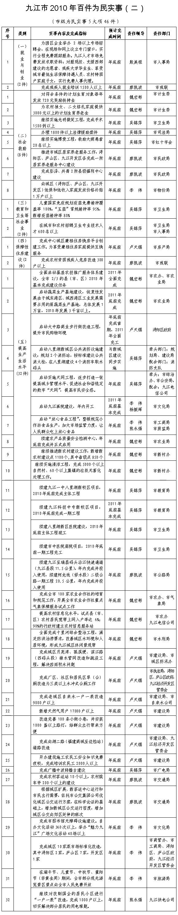 加快项目建设。坚持“六个一”的机制,继续发扬"5+2"、“白+黑”的精神,高效推进城建项目。坚持基础设施和公共服务设施“两个优先”,着力推动以八里湖新区为重点的城建工程,进一步拉开新区框架,完善新区功能,做优新区环境。加快完成一批:完成九江火车站改造、九码快速通道、濂溪大道、十里河综合整治、八里湖环湖一路、环湖三路、八里湖大道、体育中心、新区学校、新区医院一期、中医院南院、南山路、兴城大道及体育中心配套路网、浔阳东路地下人防工程、庐山旅游直升机、赛城湖公园、鹤问湖污水处理厂配套管网、第二生活垃圾处理场等工程。适时启动一批:开工建设八里湖跨湖大桥、长虹东大道、滨江西大道、八里湖生态新区东片区及浔南片区路网、大中路历史街区改造等工程,加大路面维修养护力度,着力改善公交车通行条件,启动博物馆(规划展示馆)、文化艺术中心等工程的前期准备工作。改造提升一批:启动实施中心城区24万平方米棚户区(城市低洼危旧房住宅区)改造,完成浔阳东路、滨江路、长江大道等道路沥青路面改造,完善“两湖”周边景点布局,完成百条小街小巷改造,改善老城区人居环境。通过运作城市土地、城市资本、城市资源筹资融资,确保举债有度、用债有方、还债有源,力争全年新增50亿元城建投入。积极创建国家园林城市和省生态园林城市,启动实施南湖公园、十里河景观公园、八里湖滨湖公园、奥林匹克体育公园、南山公园、龙开故道景观公园、天花井森林公园、好汉坡登山公园等十大城市公园的新建和改造提升,逐步建设完善十个精品绿地,开展十大园林绿化示范小区、十个园林绿化示范单位的创建活动,提高园林绿化和管养水平。