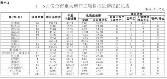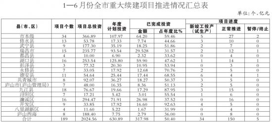 根据全市“重大项目落实年”工作要求,7月上旬,市联合督查办组织5个督查小组,对今年列入市调度的436个重大续建、新开工项目建设情况进行了一次全面实地督查。436个项目总投资3555.47亿元,其中续建项目189个,年度计划投资630.89亿元,1-6月份已完成投资317.98亿元,占年度投资计划的50.4%;新开工项目247个,年度计划投资662.97亿元,1-6月份已完成投资209.35亿元,占年度投资计划的31.58%(具体情况见附表)。