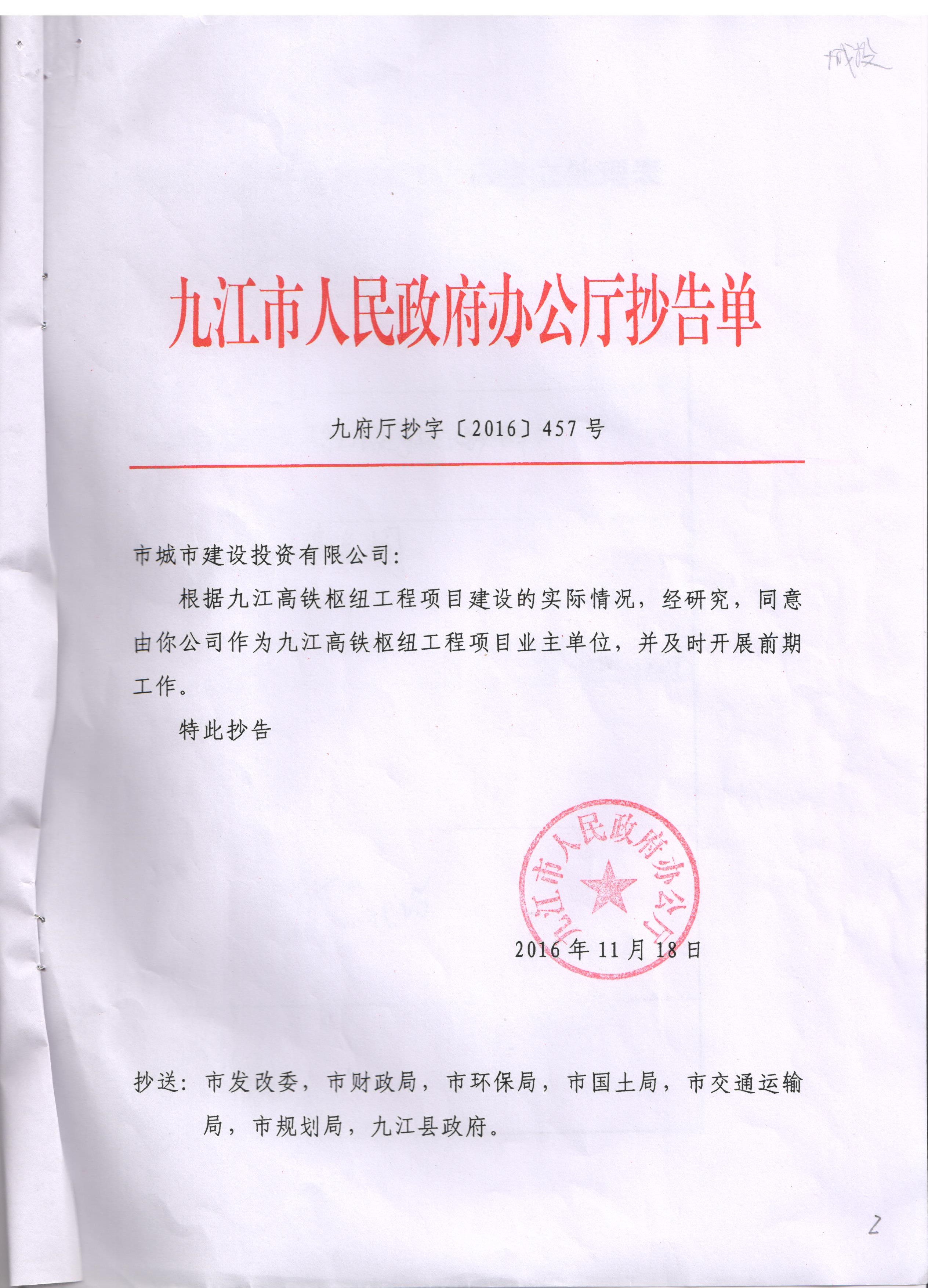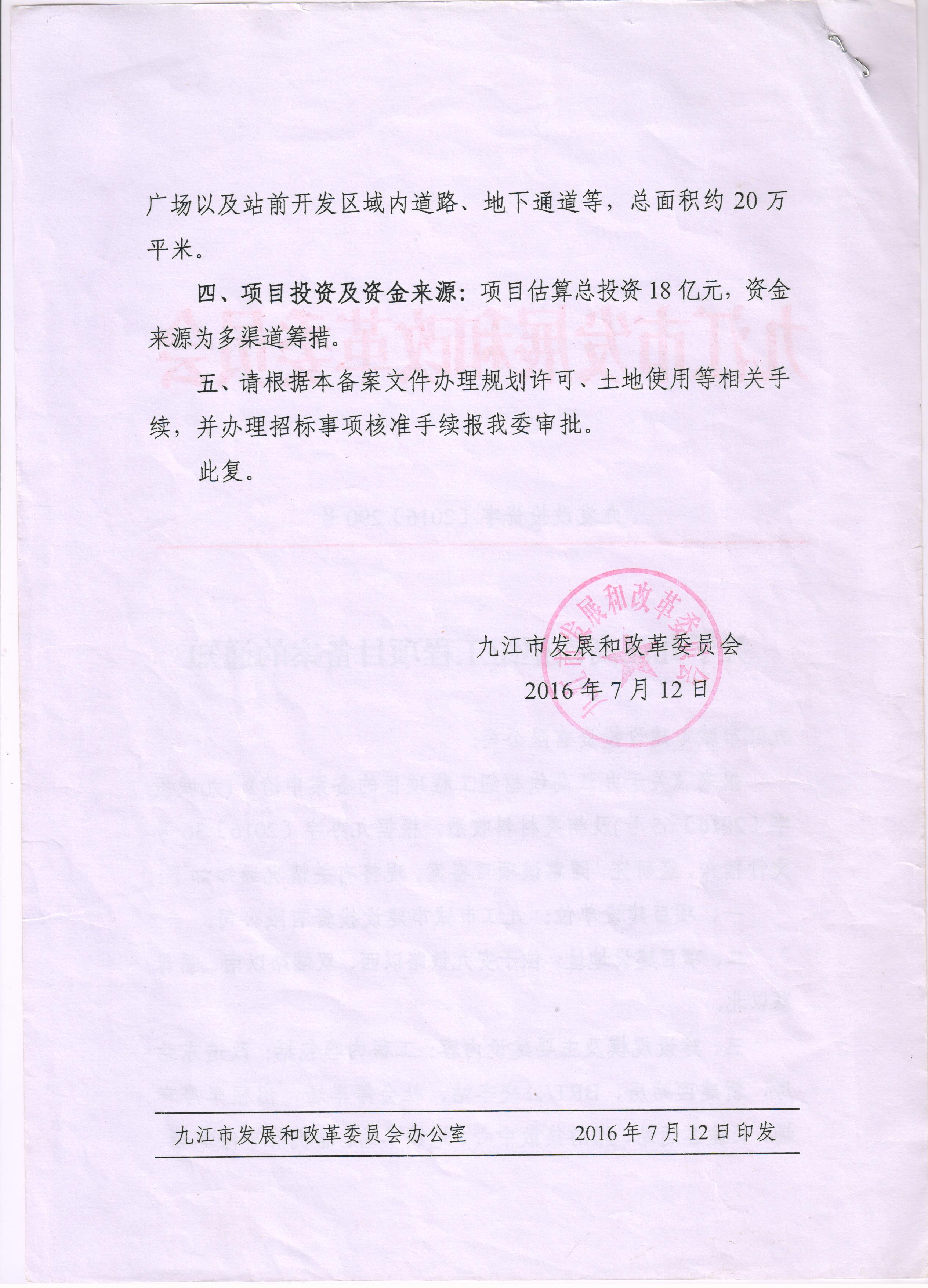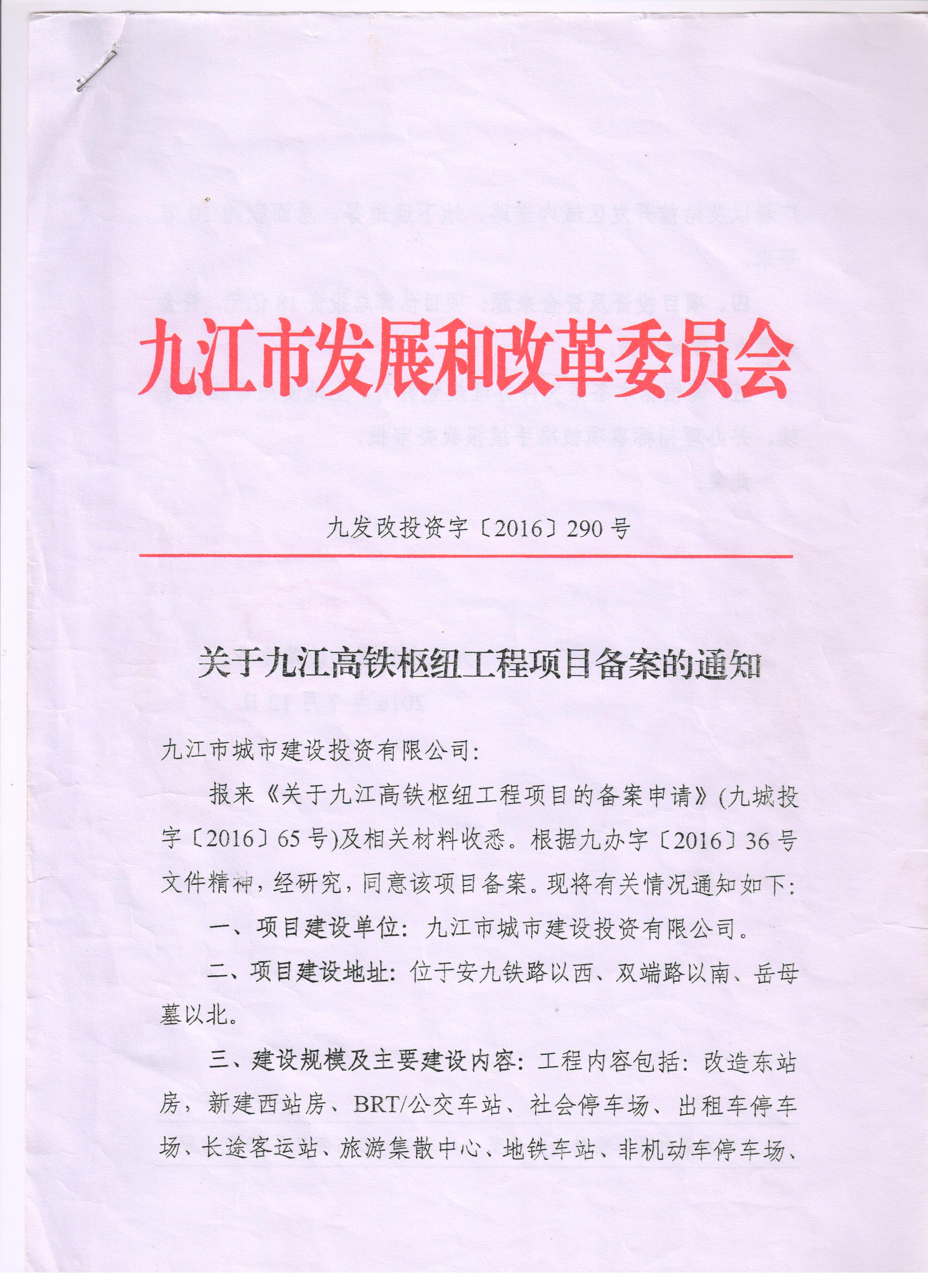 2、关于九江高铁枢纽工程项目备案的通知(九发改投资字〔2016〕290号)