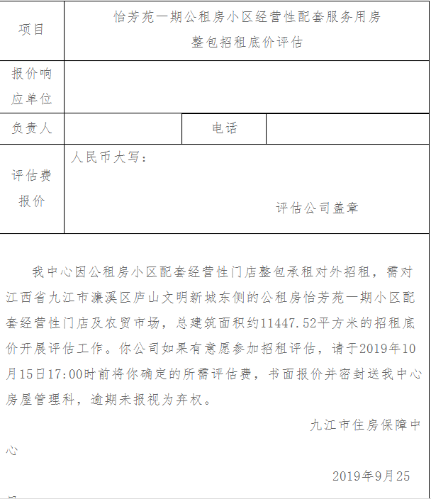 关于怡芳苑一期公租房小区经营性门店招租底价评估的公告