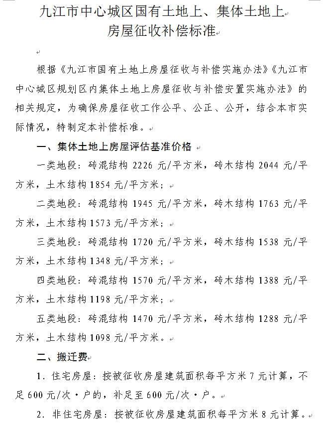 九府字〔2016〕27号九江市人民政府关于印发九江市中心城区国有土地上、集体土地上房屋征收补偿标准的通知