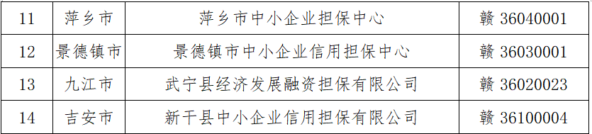 根据公司申请,按照《中华人民共和国行政许可法》《融资担保公司监督管理条例》《融资担保业务经营许可证管理办法》《江西省融资担保公司监督管理实施细则》等相关规定,注销南昌市个私民营企业信用担保有限责任公司等14家担保公司《融资担保业务经营许可证》,现公告如下: