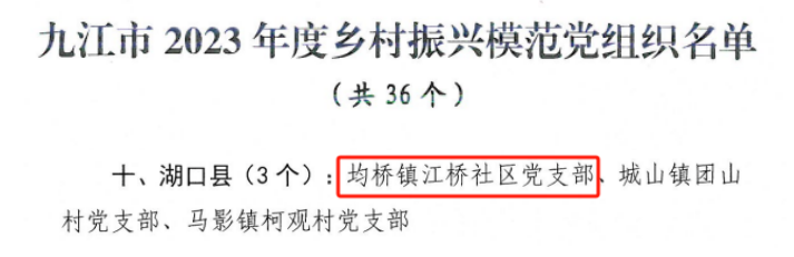 同时,均桥镇江桥社区党支部荣获全市2023年度乡村振兴模范党组织。为激励全市村党组织在全面推进乡村振兴中展现新担当新作为,充分发挥示范引领、辐射带动作用,经乡镇推荐、县级推选、市级研究,确定了包括江桥社区党支部在内的36个村党组织为全市2023年度乡村振兴模范党组织。九江市文化广电旅游局将以这些荣誉为动力,持续优化驻村干部选派管理,更好地发挥在巩固拓展脱贫攻坚成果、全面推进乡村振兴中的重要作用,为九江市打造“三个区域中心”、建设“一个美好家园”,奋力谱写中国式现代化的九江篇章贡献文旅力量。