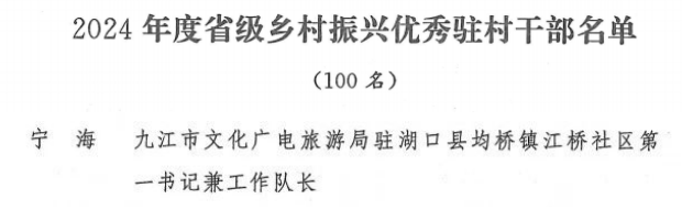 近日,九江市文化广电旅游局传来喜讯,在乡村振兴工作中,驻湖口县均桥镇江桥社区第一书记兼工作队长宁海荣获2024年度省级乡村振兴优秀驻村干部。