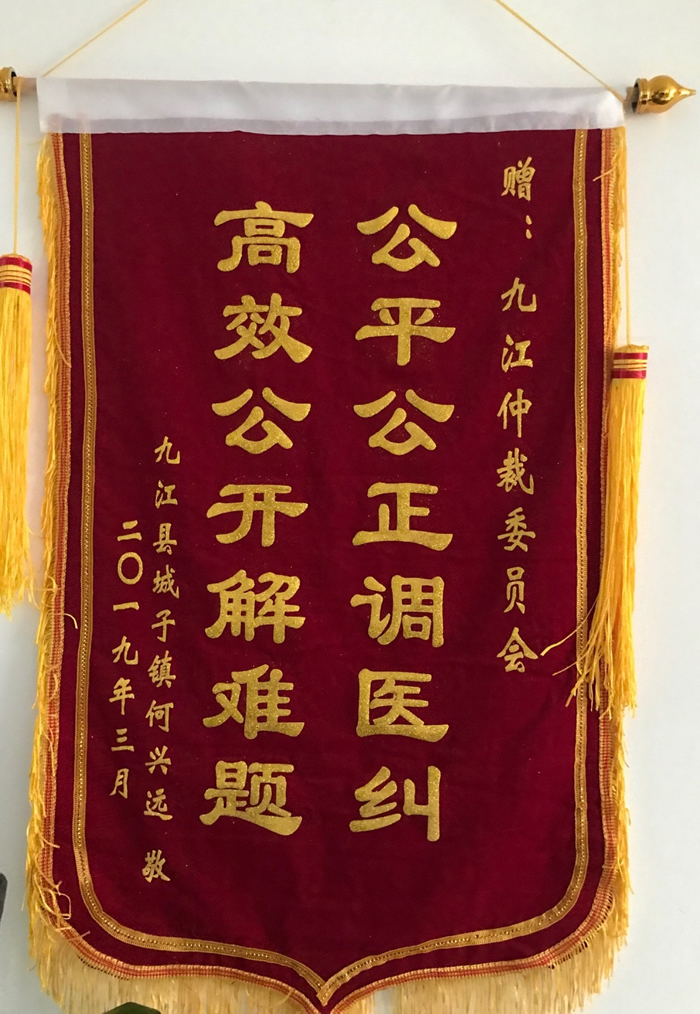 4月1日上午,患者何某将写有“公平公正调医纠,高效公开解难题”的锦旗送到九江仲裁委员会,以表达对九江仲裁委员会公平、公正、高效解决医患纠纷的感谢。