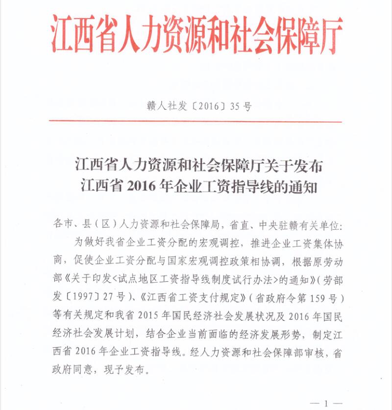 江西省人力资源和社会保障厅关于发布江西省2016年企业工资指导线的通知