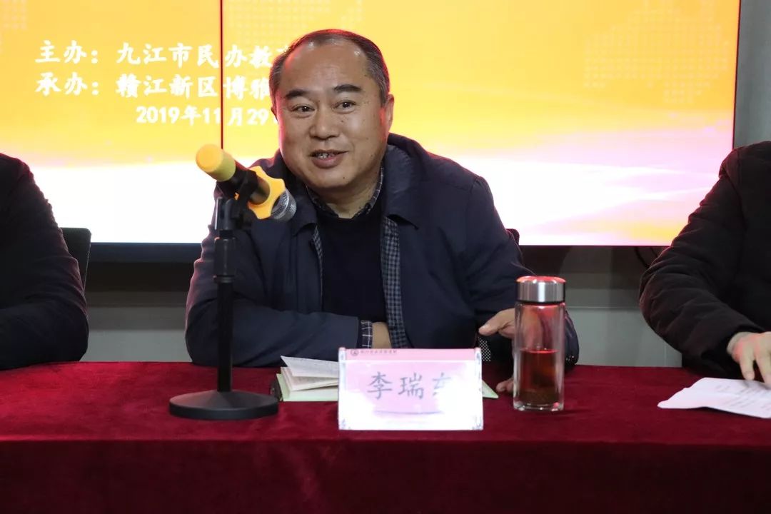 赣江新区博雅学校、九江市晨光中学、都昌县第三中学、九江市理工职业技术学院、濂溪小学等学校校长代表依次发言。他们对各自学校的办学理念和特色进行了详细介绍,就学校如何更好发展进行了交流学习,分享和探讨了好的工作做法和经验。九江市民办教育协会会长李瑞东在会上提出市民办教育协会以要搭建平台,以学术立会;促进交流,以拓展视野立会;做实事,以服务立会;守章程,以规范立会为工作思路,落实好教育协会2019年工作计划。他就如何办好一所学校,如何当好一名校长,如何对学生施行有效的管理提出了合理化建议,民办学校尤其要关注改革、关注教研、关注师资队伍建设、关注学生发展,校长要提升人格魅力,加强学校的管理。市教育局党委委员、副局长刘金梅发表讲话。他指出民办教育协会在为政府提供决策依据,促进民办学校交流方面有着不可替代的作用,协会也切实发挥了沟通桥梁的作用,为民办学校提供了交流学习机会。他表示九江市民办教育已成为我市教育事业发展中的重要力量,促进其健康发展是当下的重要任务。同时他对市民办教育提出殷切期望,民办学校要积极参与协会的各项活动,做到情系教育、热爱教育、贡献教育,他强调,民办学校要进一步加强在党建、师德师风建设、规范办学等方面工作。