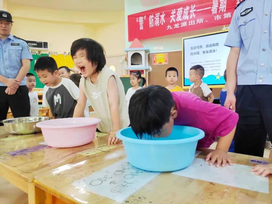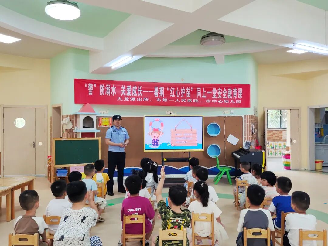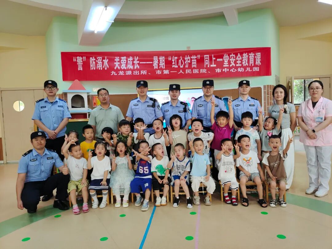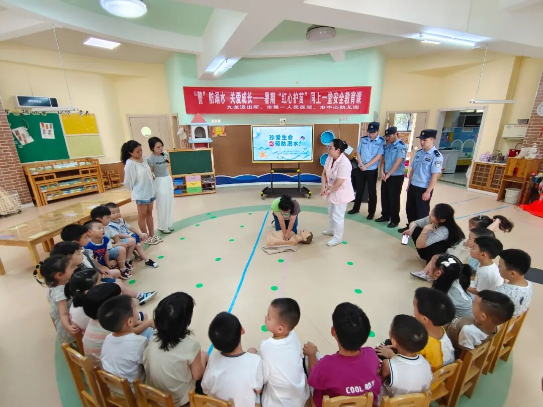 火热七月、热浪如歌!九江市中心幼儿园“红心护苗”暑期托管活动已进入到第三周。为进一步丰富孩子们的在园活动,7月18日,市中心幼儿园联合九龙派出所、市第一人民医院共同举办了一场别开生面的防溺水安全教育活动。