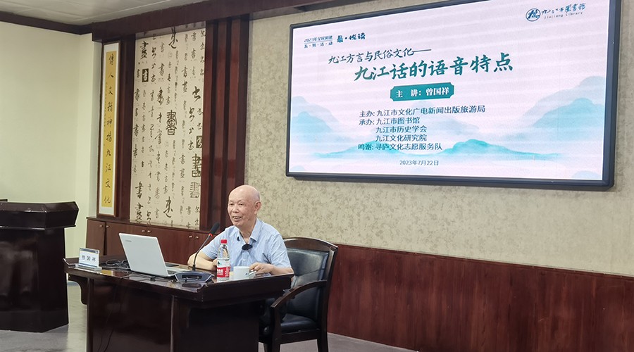 7月22日上午,由九江市文化广电新闻出版旅游局主办,九江市图书馆承办的寻庐讲坛“九江方言与民俗文化——浅谈九江人口变迁与方言”人文讲座在九江市图书馆三楼第二报告厅开讲。本次讲座邀请了九江市职业大学副教授、江西省语言学会会员、九江传统文化研究会名誉会长曾国祥主讲。
