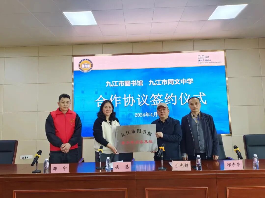 为延伸与拓展公共图书馆服务效能,推动我市公共文化服务体系建设,加强馆校合作,打造书香浔城,4月9日上午,九江市图书馆走进九江市同文中学举办阅读推广合作协议签约暨“九江市图书馆青少年阅读基地”授牌仪式。这标志着九江市同文中学正式纳入我市中心城区公共图书馆总分馆体系,同文中学图书馆与市图书馆实现了图书的通借通还。