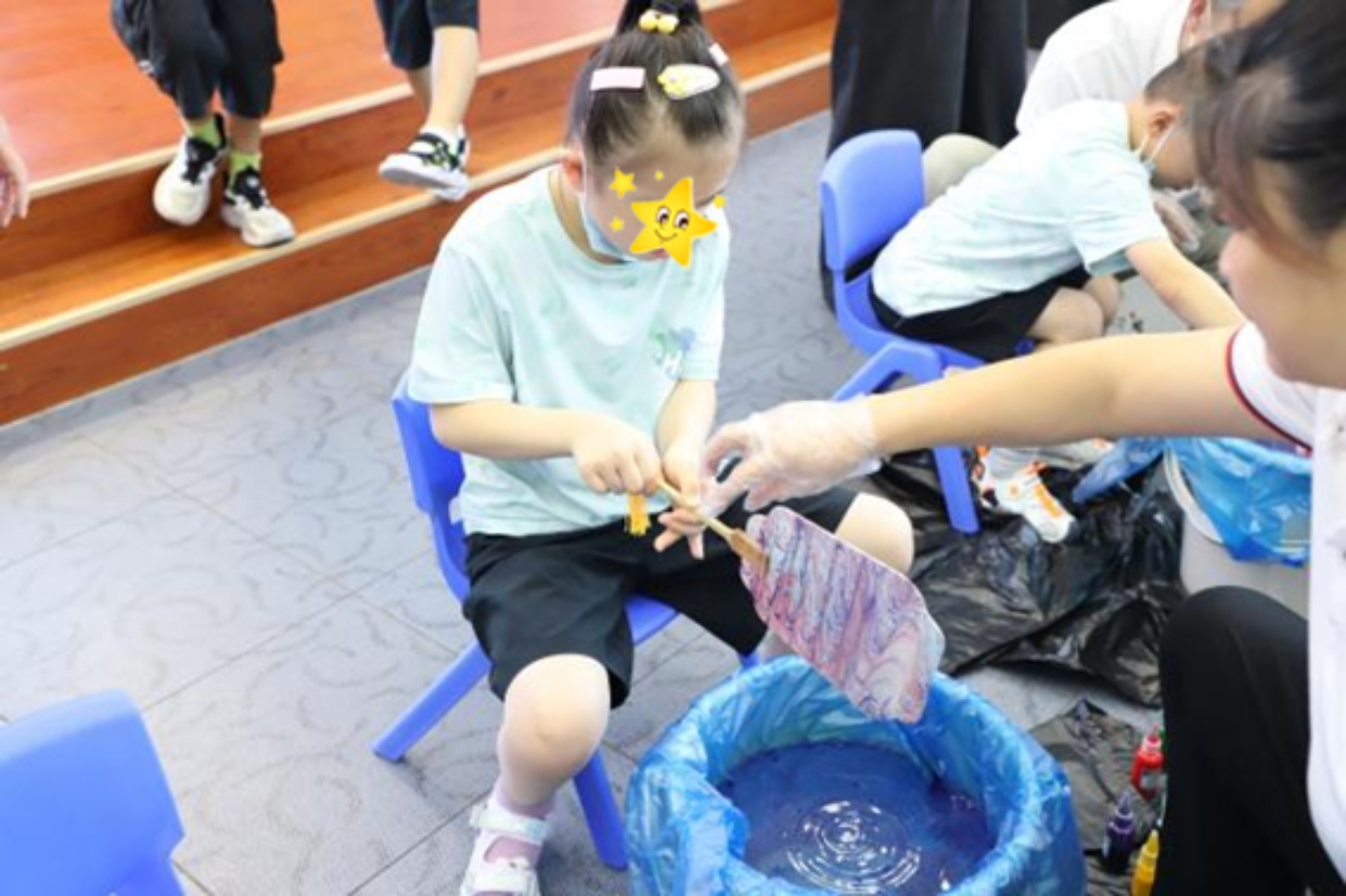 捐赠仪式结束后,精彩的非遗体验项目正式登场。在非遗手工体验区,孩子们积极参与扎染、漆扇制作和漆包创作等活动。他们在工作人员的指导下,大胆尝试各种手法,时而专注思考,时而与身边的伙伴或爱心人士交流。当看到自己的作品逐渐成型时,孩子们脸上洋溢着自豪的笑容,用行动诠释着对传统文化的喜爱,也展现出动手能力与创造力。