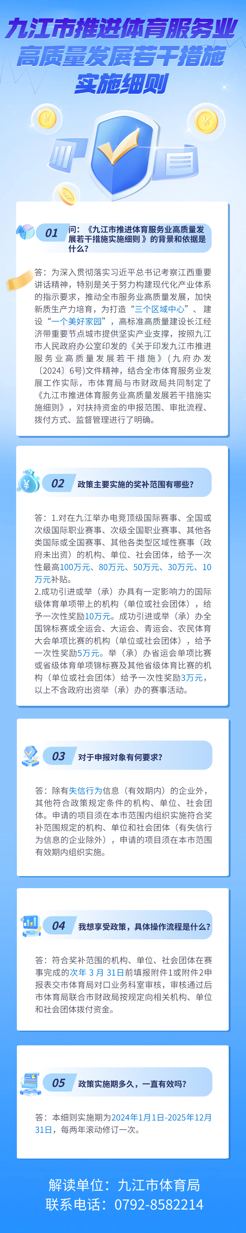 关联导读:九体发字〔2024〕42号关于印发《九江市推进体育服务业高质量发展若干措施实施细则 》的通知