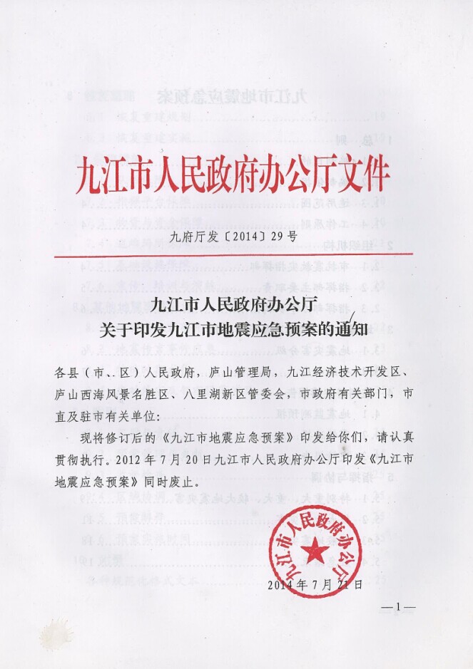 九江市人民政府办公室关于印发九江市地震应急预案的通知