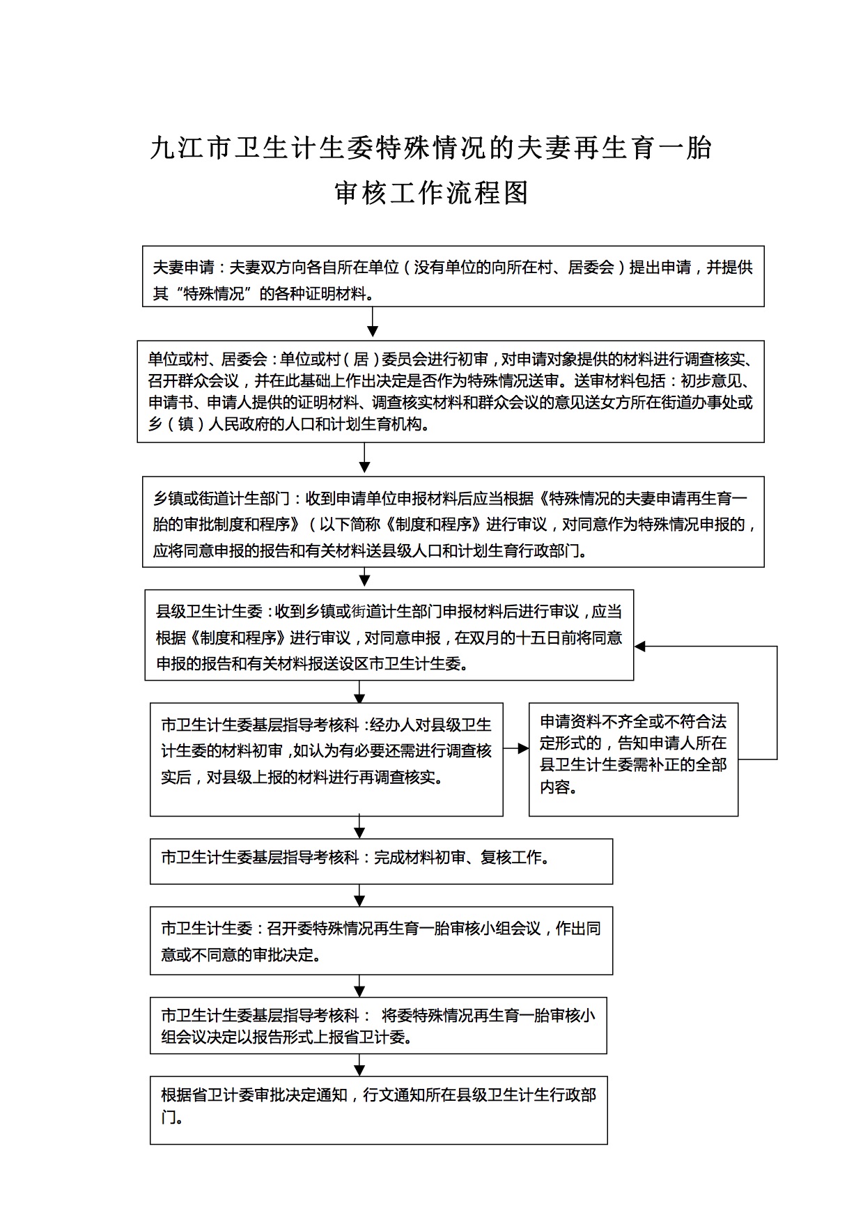 指导考核科:九江市卫生计生委特殊情况的夫妻再生育一胎审核工作流程图